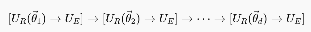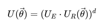 여기서 U_R(\theta)는 회전 게이트 블록, U_E는 얽힘 블록이며, d는 반복 깊이(depth)를 의미한다. 이 수식은 회로 구조를 다음과 같은 반복 형태로 구성함을 나타낸다: