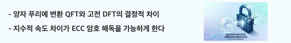 n = 256일 때 고전 FFT는 약 256 × 2²⁵⁶번의 연산이 필요하지만 QFT는 약 65,536개의 양자 게이트만으로 충분합니다. 이 지수적 속도 차이가 쇼어 알고리즘으로 ECC를 해독할 수 있는 근본 이유입니다.